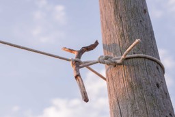 Anchor your clothesline by passing the end with the loop behind the post or tree you are anchoring to. Now, take a bite of clothesline and pass it through the loop you tied at the end of the line. Place your toggle through the bite of rope so that it cannot be pulled back through the loop.