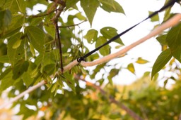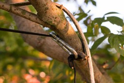 At the other end of the line, attach the line to your second anchor point by wrapping the end of the prusik loop with the carabiner around your anchor and clipping the carabiner back onto the prusik. Holding the free end of the clothesline, pull the line tight. Push the prusik knot forward to catch your progress. Pull the line tight and push the knot forward until it’s as tight as you’d like. It can help to throw the end of the line you are pulling over a branch so that the direction of pull is vertical instead of horizontal.